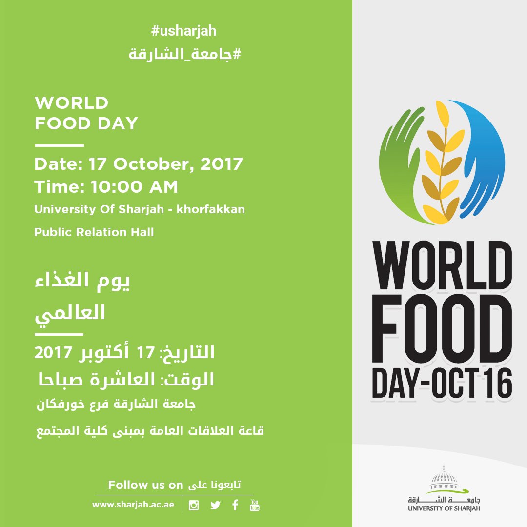 Uos On Twitter دعوة لحضور فعالية يوم الغذاء العالمي World Food Day جامعة الشارقة فرع خورفكان يوم الغذاء العالمي Uos Usharjah Worldfoodday2017 Https T Co Sesdrcjkwa