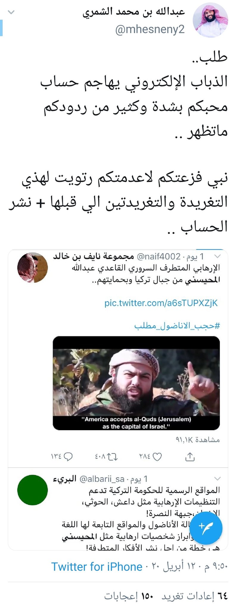 البريء على تويتر الارهابي عبدالله المحيسني يدافع عن وكالة الأناضول وقناة Trt التركية ويهاجم المغردين السعوديين المحيسني غير لقبه الى الشمري للتحايل على قوانين تويتر حسابه العربي Mhesneny2 حسابه باللغة التركية Dmuhaysini لاوصيكم بلاغ
